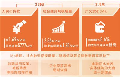 中國人民大學重陽金融研究院副院長董希淼認為,總體來看,3月份廣義貨幣增速、社會融資規模增量、新增信貸等關鍵數據增高,是前期貨幣政策、減稅降費等措施發揮作用的體現,同時企業貸款需求也在逐漸恢復,金融活水滋養實體經濟的力度進一步增強。